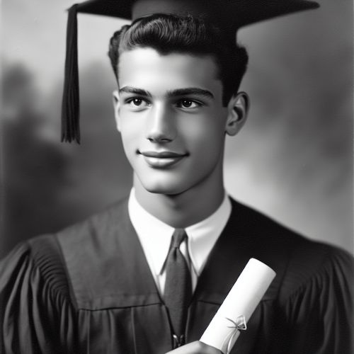 [[Image:Detail-145618.jpg|thumb|center|A black and white photograph of a young Michael Dukakis in a graduation gown, holding a diploma.|class=only_on_desktop]] | |||