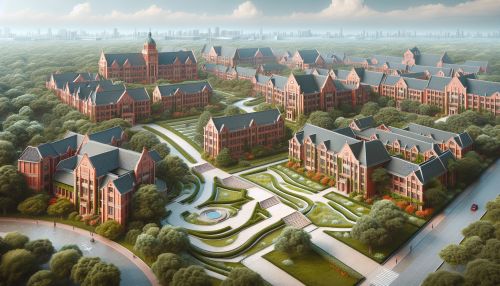 A view of the Aligarh Muslim University campus with its distinctive red brick buildings and lush greenery.
