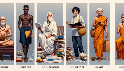 The concept of Ashrama originates from the ancient Hindu scriptures known as the Vedas. The term 'Ashrama' itself is derived from the Sanskrit root 'śram' meaning to exert or labor, implying the effort and discipline required in each stage of life. The philosophy of Ashrama is intertwined with the Hindu concepts of Dharma (duty) and Moksha (liberation), and is seen as a path to achieving spiritual fulfillment and ultimate liberation.