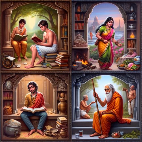 Four individuals representing the four stages of Ashrama: a student, a householder, a hermit, and a renunciate.