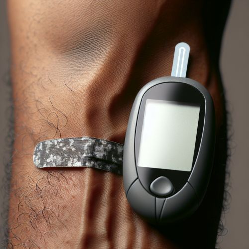 A close-up image of a continuous glucose monitor device attached to a person's arm.