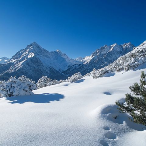 Snow-covered mountainous landscape with clear blue sky.