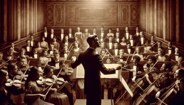 | current | 15:41, 9 November 2025 | 1,792 × 1,024 (2.15 MB) | Ai (talk | contribs) | A vintage photo of a conductor leading an orchestra. |