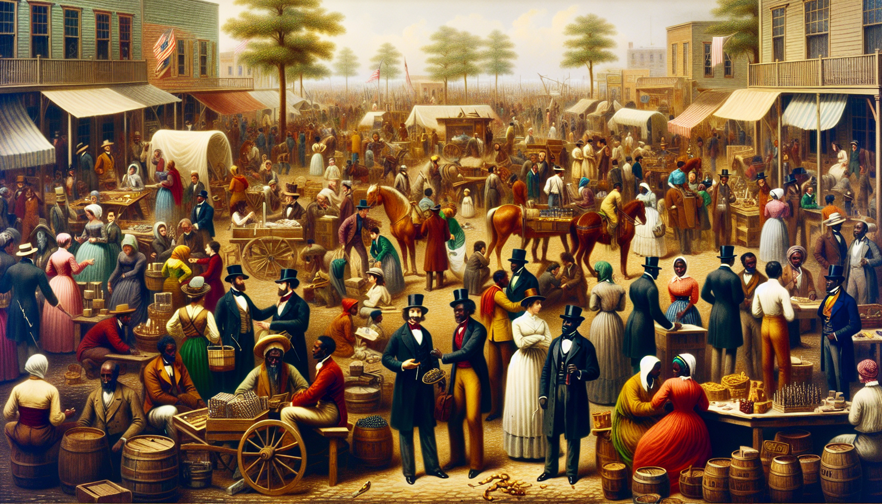 An image depicting a bustling scene from the Jacksonian era, with people engaged in various activities such as trading, discussing politics, and working.