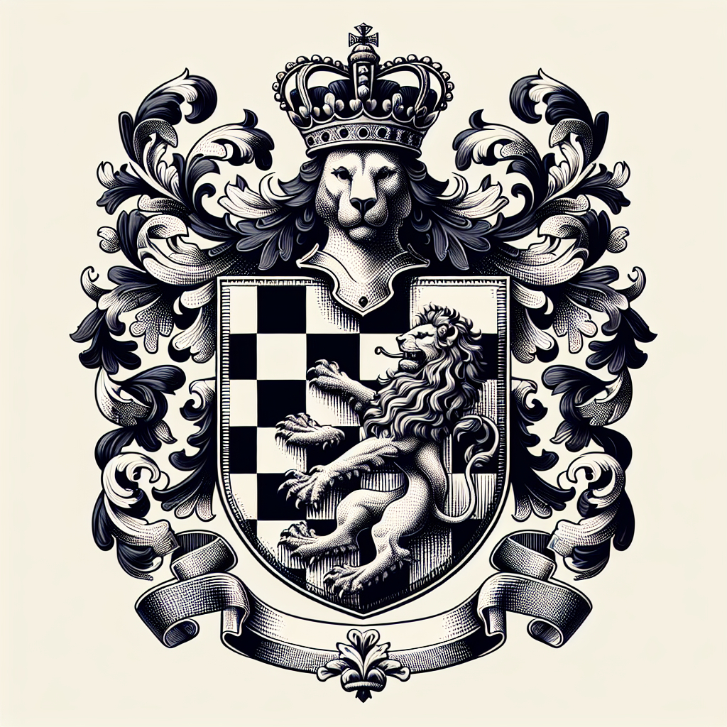 A depiction of the Stewart family coat of arms, featuring a shield with a chequered pattern and a crowned lion rampant.