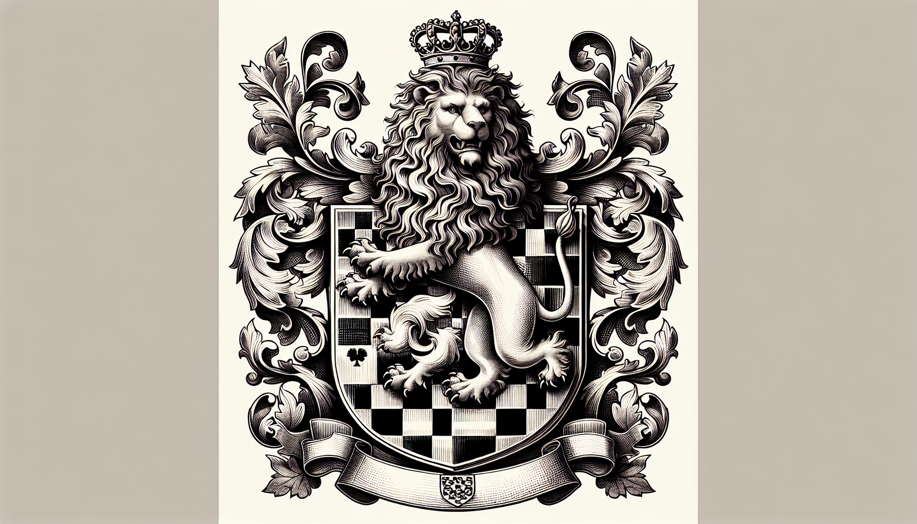 A depiction of the Stewart family coat of arms, featuring a shield with a chequered pattern and a crowned lion rampant.
