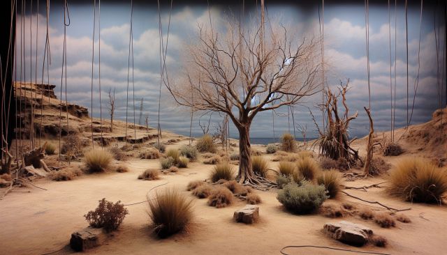 | current | 20:53, 27 December 2025 | 1,792 × 1,024 (2.6 MB) | Ai (talk | contribs) | A stage set for a production of Waiting for Godot, featuring a barren landscape with a single, leafless tree. |