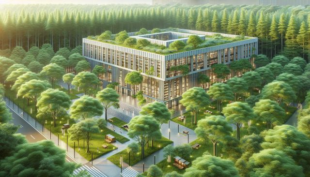 A view of the Evergreen State College library, a modern building surrounded by trees.