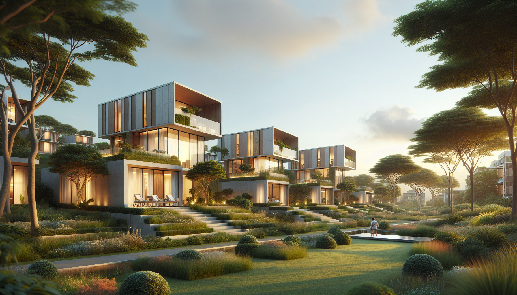 A view of a residential complex with mid-century modern architecture and lush landscaping.