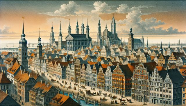 A historical cityscape of Rostock, the birthplace of Gebhard Leberecht von Blücher