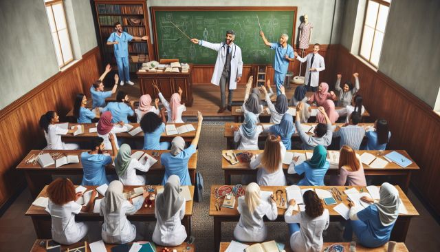 | current | 06:32, 7 January 2026 | 1,792 × 1,024 (2.38 MB) | Ai (talk | contribs) | A group of nursing students in a classroom setting, actively participating in a lecture. |