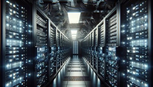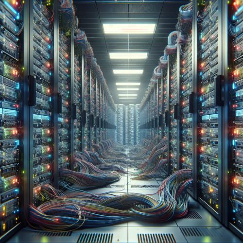 A computer server room with rows of machines. Each machine is generating and storing machine data.