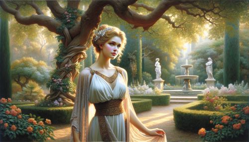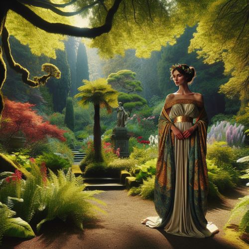 A depiction of a woman in classical Greek attire, possibly in a garden or forest setting.