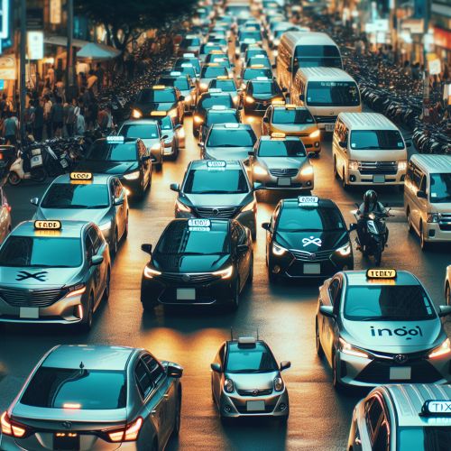 A busy city street with a variety of cars, some of which are identifiable as ride-hailing vehicles due to the company logos displayed in their windows.