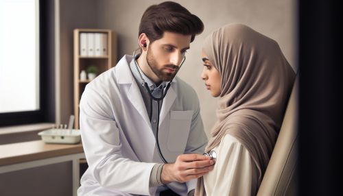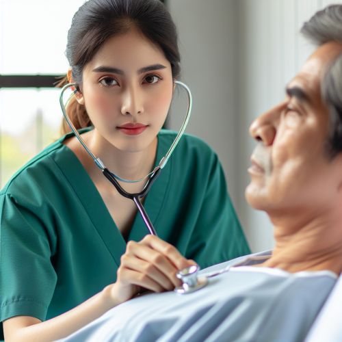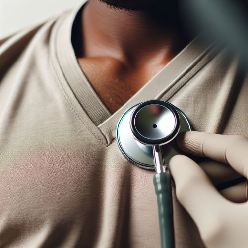 A medical professional using a stethoscope to listen to a patient's heart.