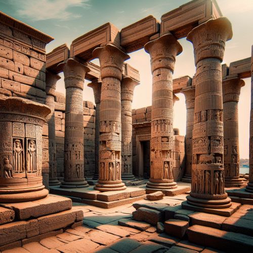 A view of the Temple of Philae with its stone pillars and carvings.