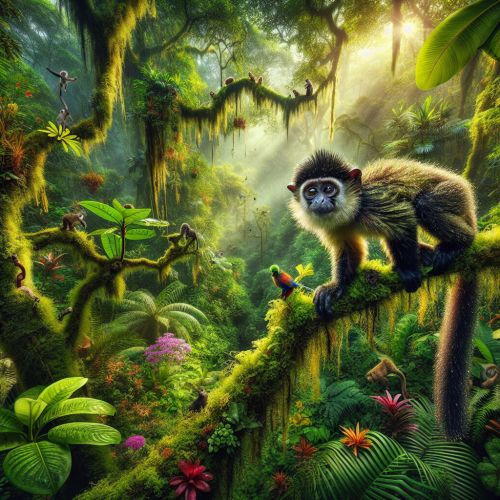 A Titi Monkey sitting on a tree branch in the rainforest.